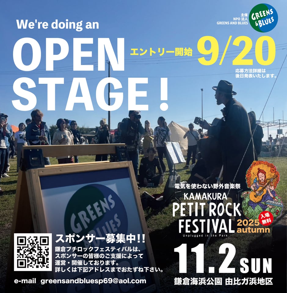 今回もオープンステージやります。前回は口コミで広がり、どのように公募するかを検討出来ないまま、告知する前に枠が埋まってしまいました。その反省点から、今回は Web フォームから先着順で確定する運びとなりました。お申込みフォームは 9/20(Sat) にUPする予定となっております。HP、Facebook を随時チェックしてください。また、スポンサーも随時募集しています!詳しくは、greensandbluesp69@aol.com までお問い合わせください!